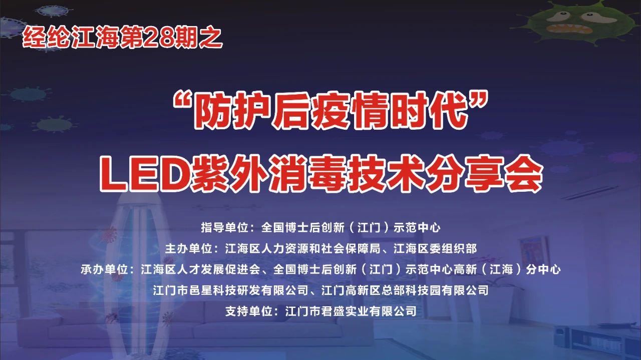 8月21日下午,由全国博士后创新(江门)中心指导,江门市江海区人力资源和社会保障局、江海区委组织部主办,江海区人才发展促进会、全国博士后创新(江门)示范中心高新(江海)分中心、江门市邑星科技研发有限公司、江门高新区总部科技园有限公司承办,球王会入口支持,在高新区金融中心三楼举办了一场【经纶江海】第28期之“防护后疫情时代”LED紫外消毒技术分享会。